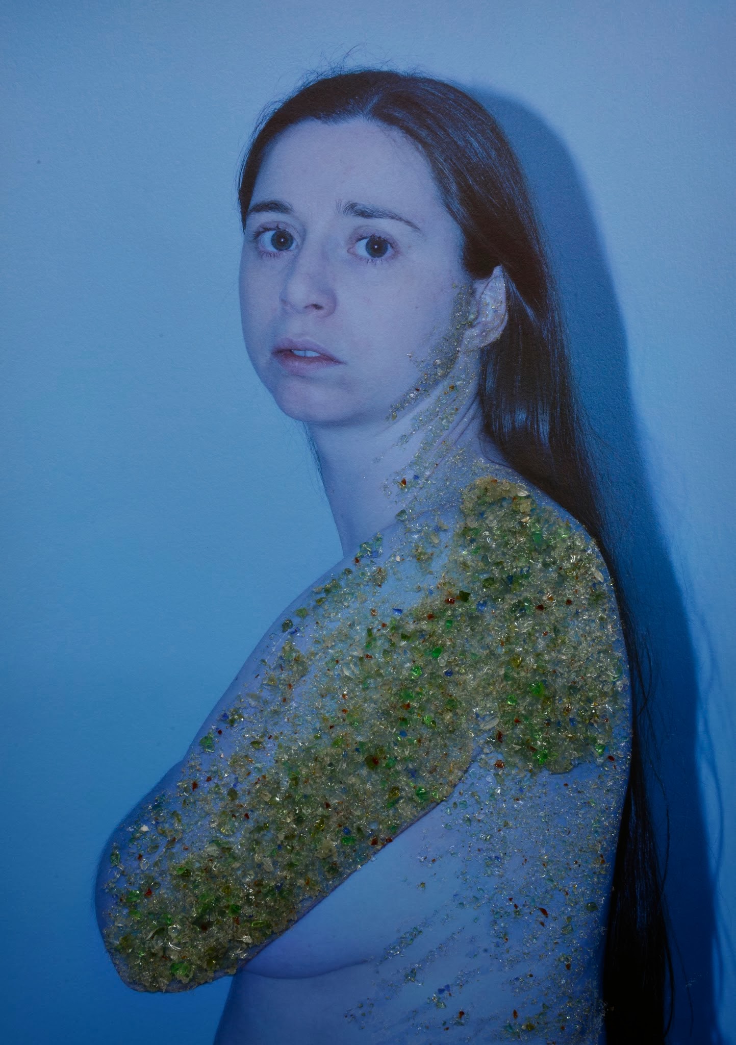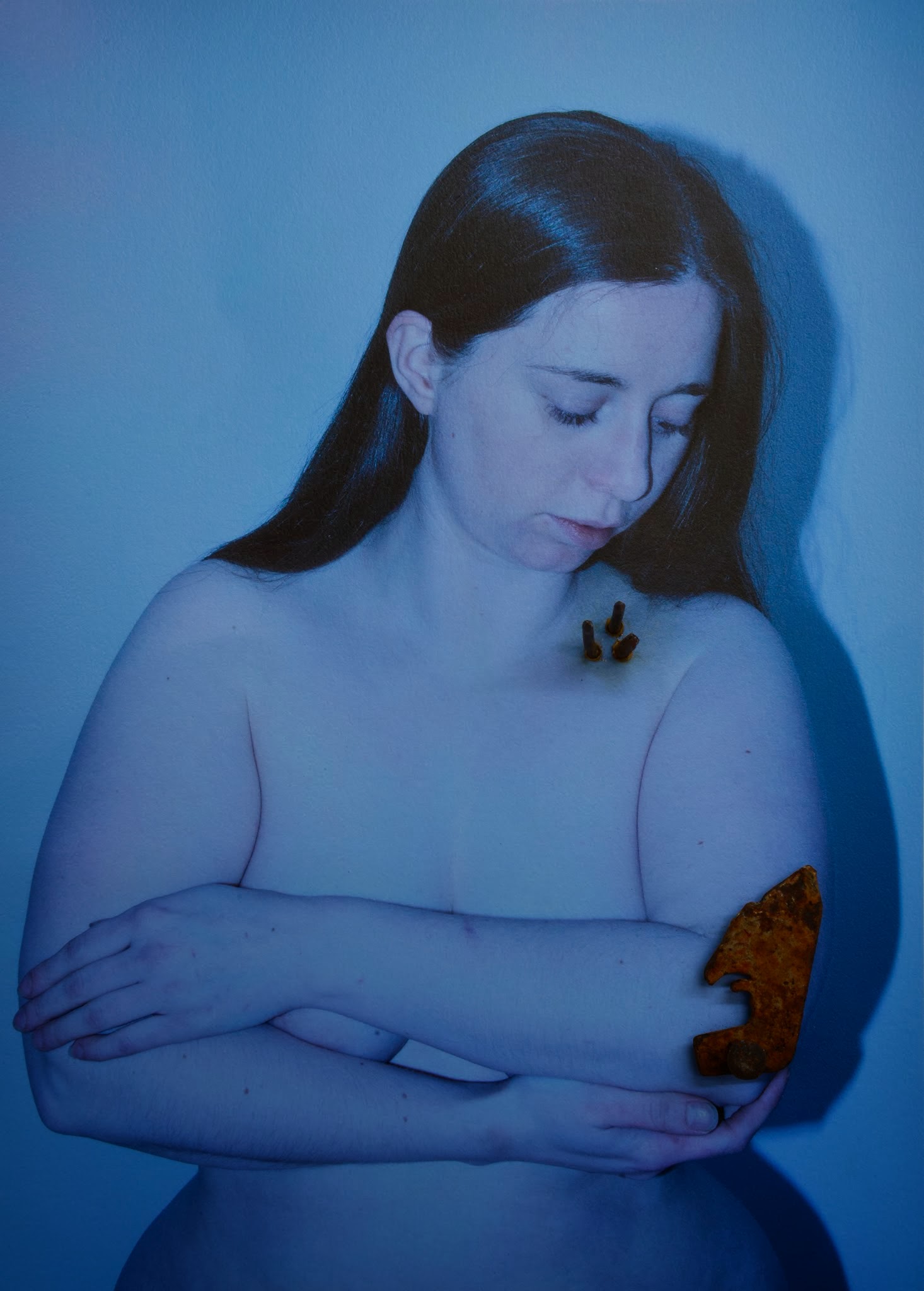 In my studio I experimented with the these found objects; glass, rusted metals, barnacles and bones. Over an extended period, I figured out how I would be able to use these objects as symbols of pain in self-portraits. I set up a camera on a timer and lights covered in a blue ‘gel’. I then performed a variety pre-planned poses for the camera. Next I carefully selected the shots and had them printed, life-sized on a heavy ‘hahnemuhle’ fine art paper.