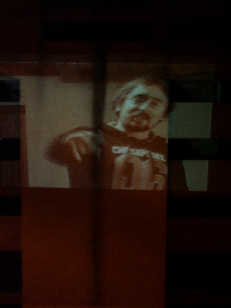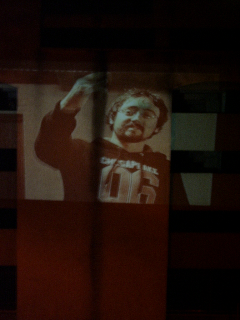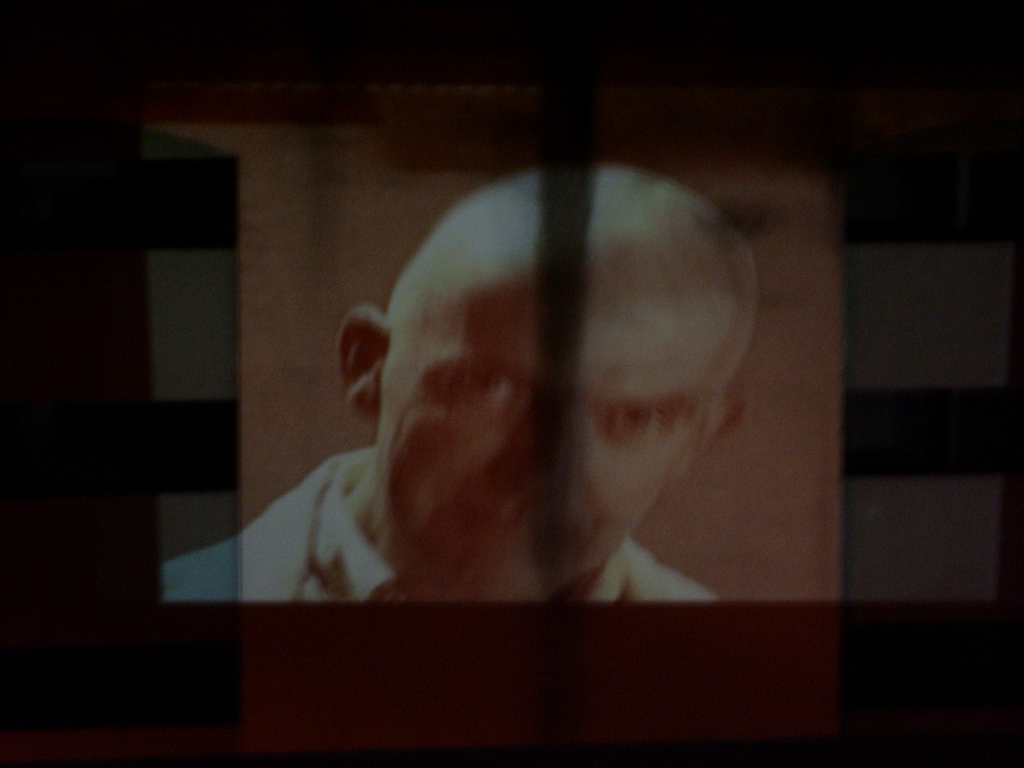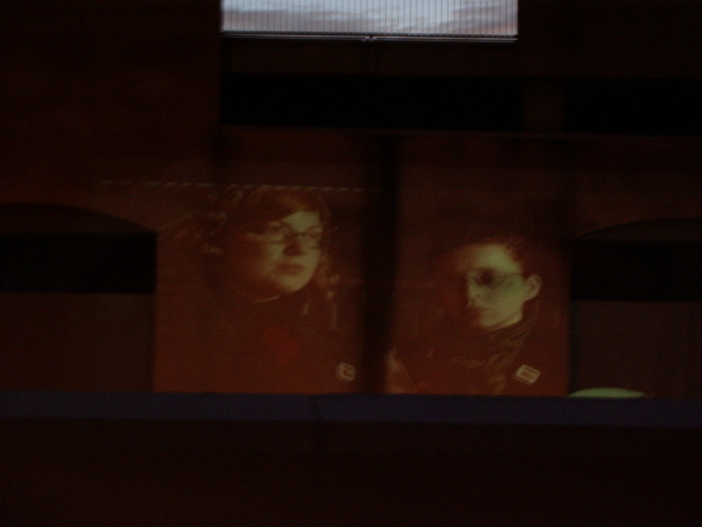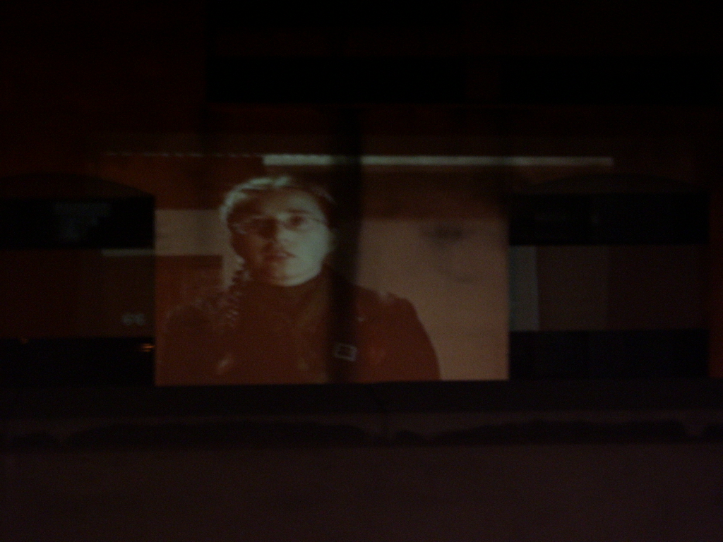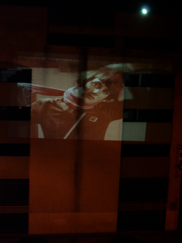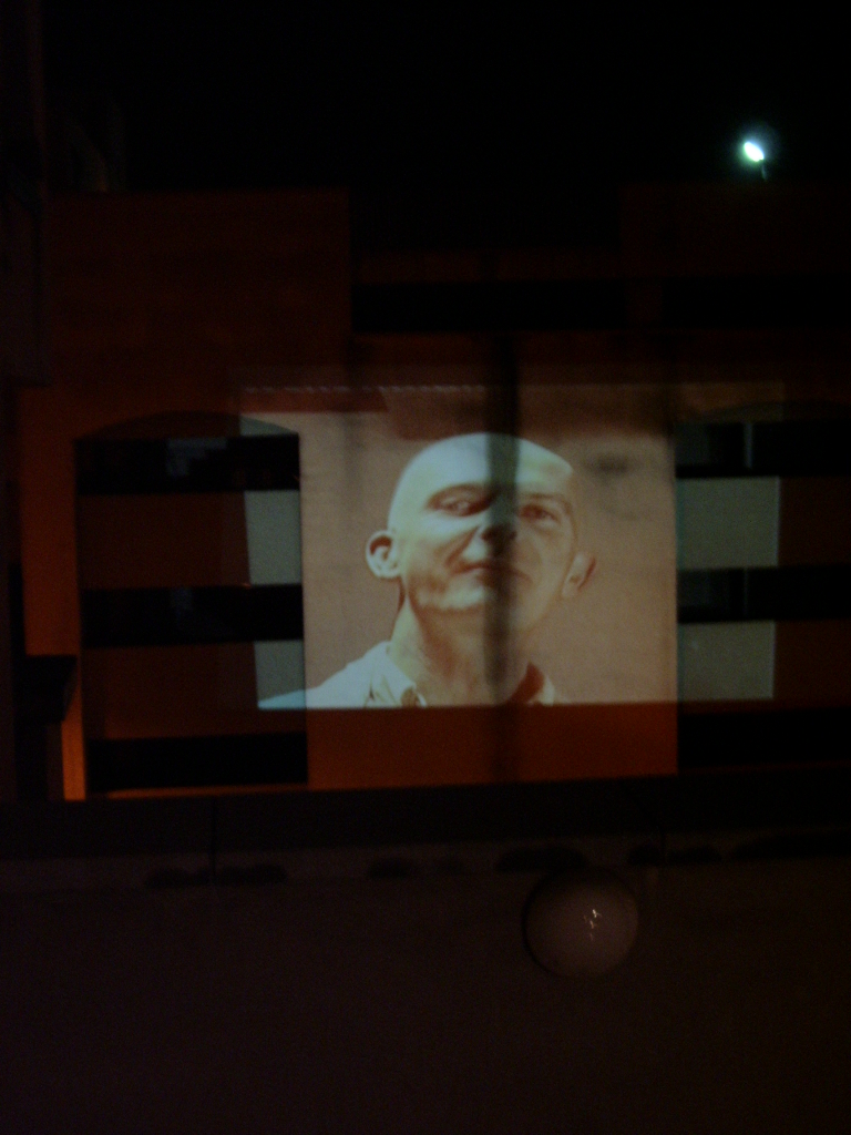 A live-feed of screen tests/ moving portraits projected onto a nearby car park at 30-40 ft